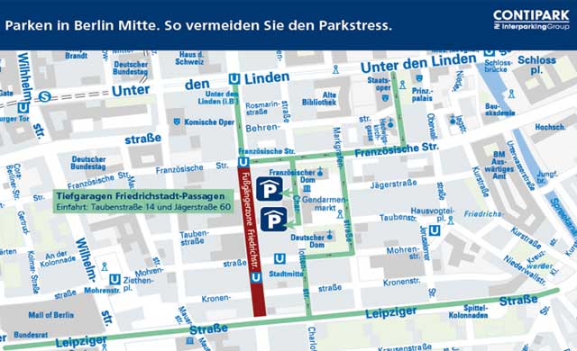 In der Contipark Tiefgarage Friedrichstadt-Passagen (Q 206) parken Sie mit der Pcard besonders komfortabel, ticketlos und bargeldlos. Zusätzlich profitieren Sie von attraktiven Parktarifen – für ein angenehmes und stressfreies Besuchserlebnis im Zentrum Berlins.